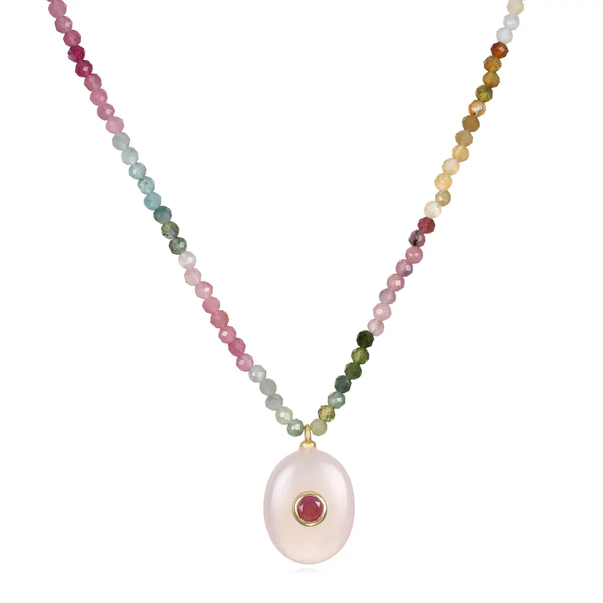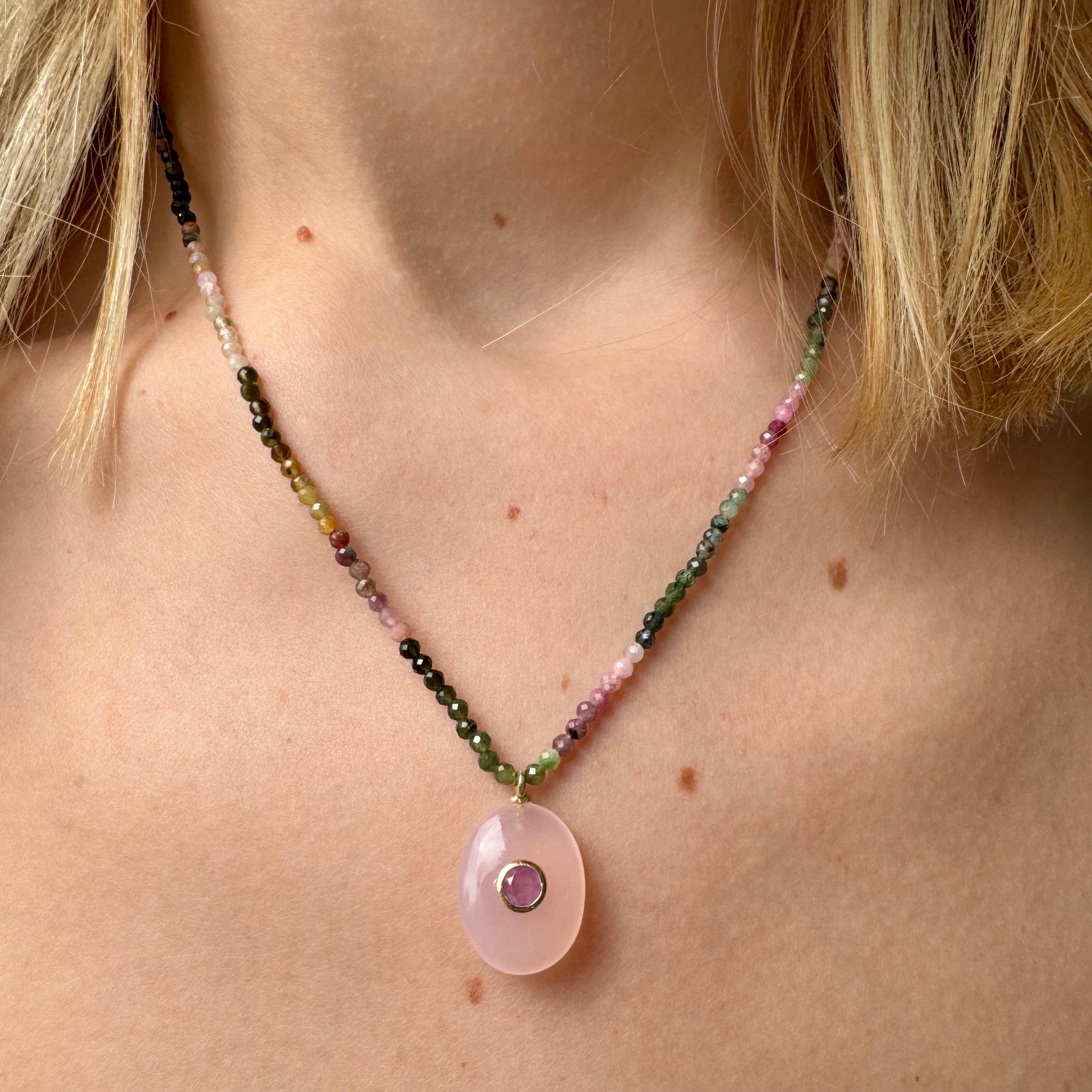• Oval-shaped pink chalcedony bezel set with pink sapphire