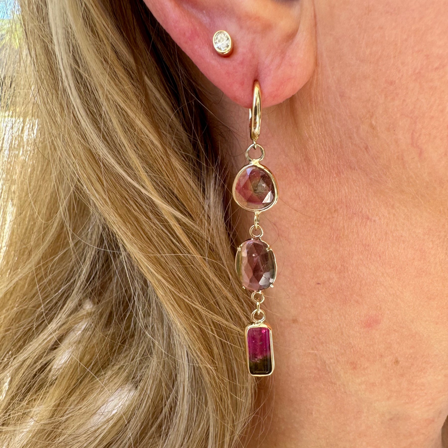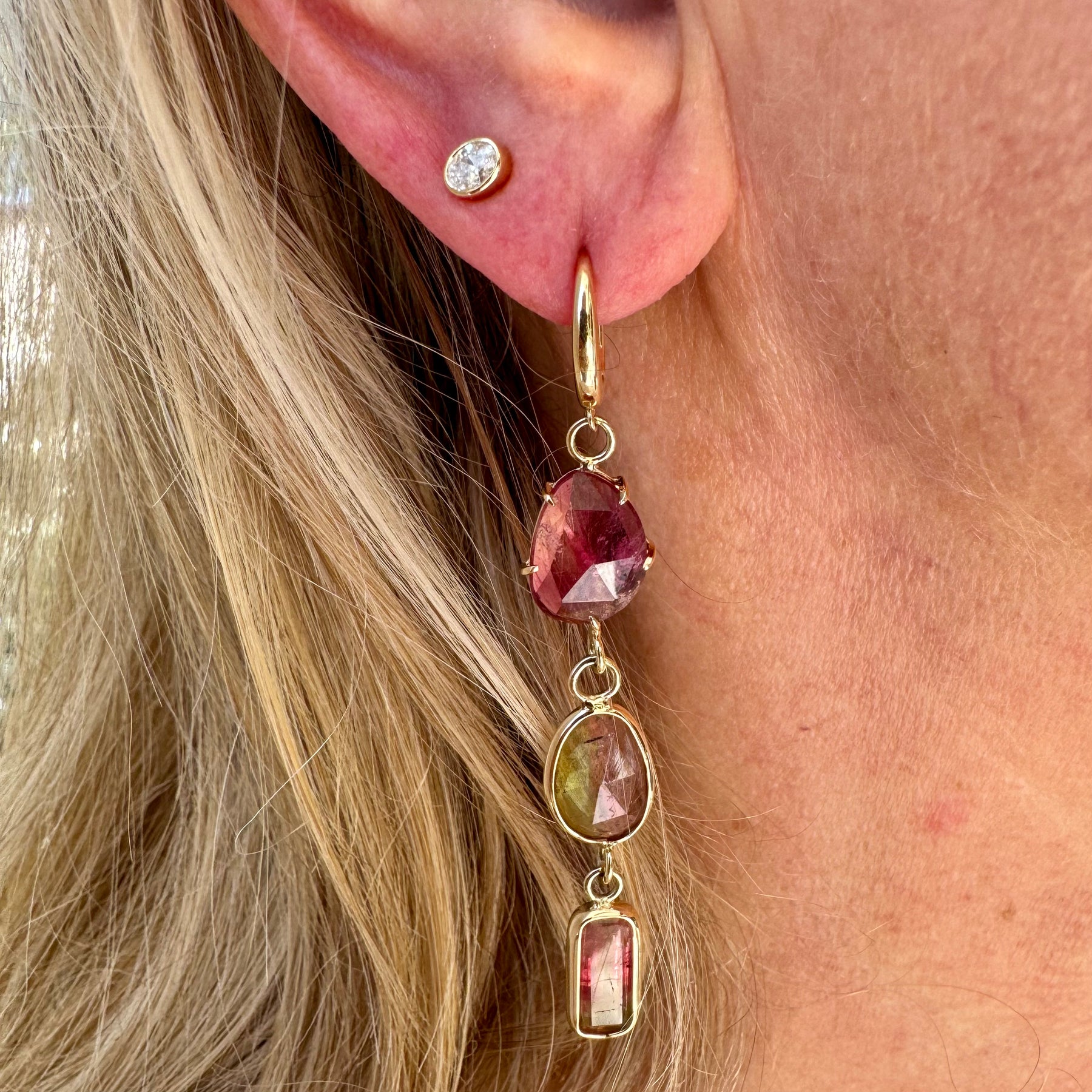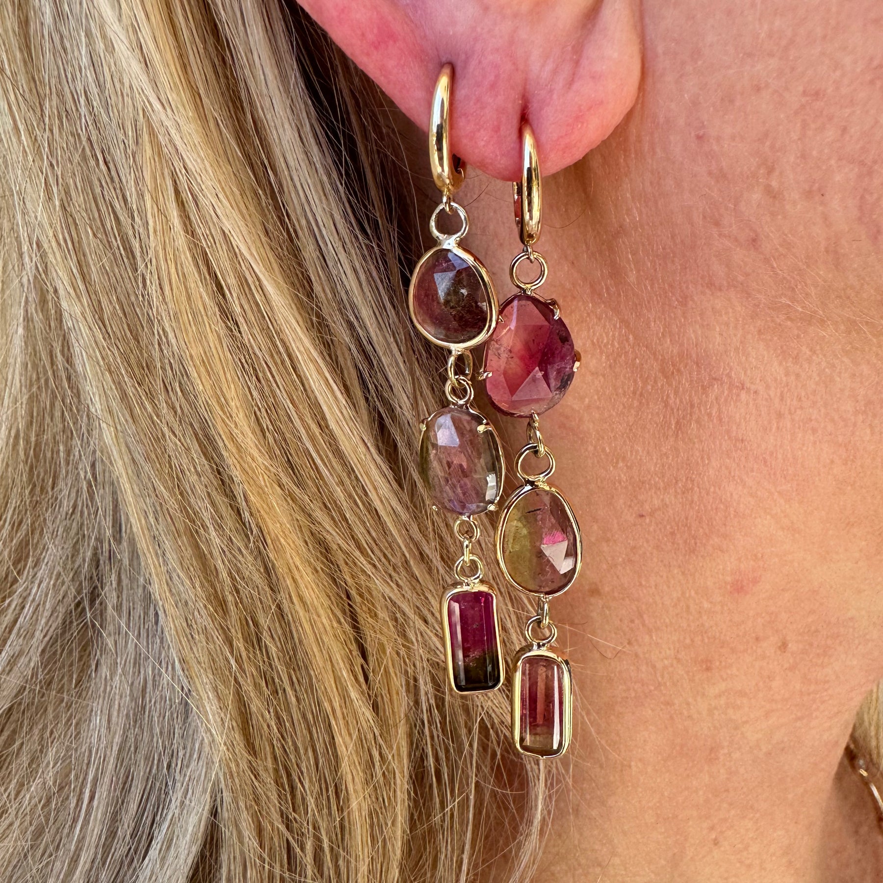 Beautiful, colorful and one-of-a-kind! These earrings feature mismatch watermelon tourmalines set in prongs & bezels. What's not to love!