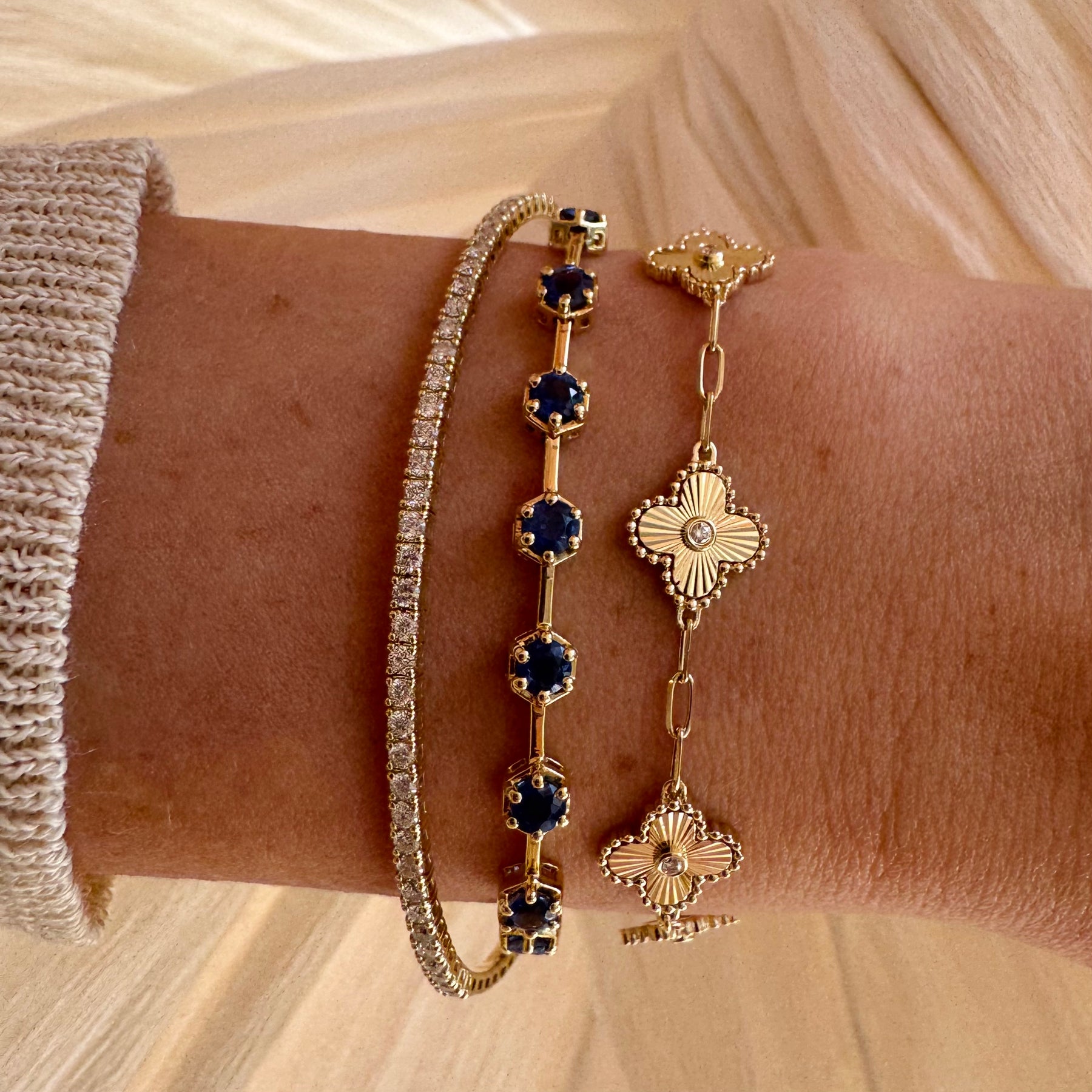 A unique take on a tennis bracelet! Blue sapphires are separated by gold segment bars, which creates a modern look. This bracelet is also finished with a safety clap