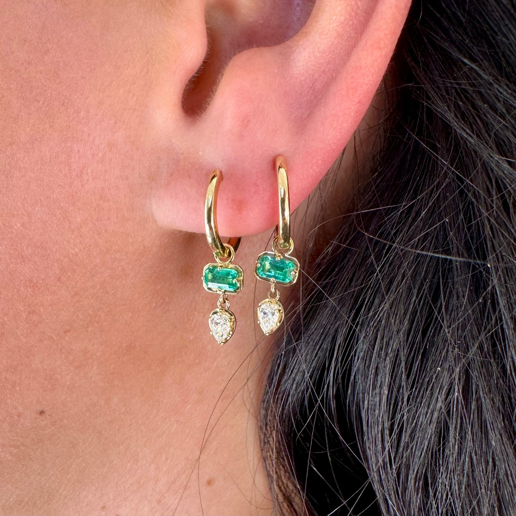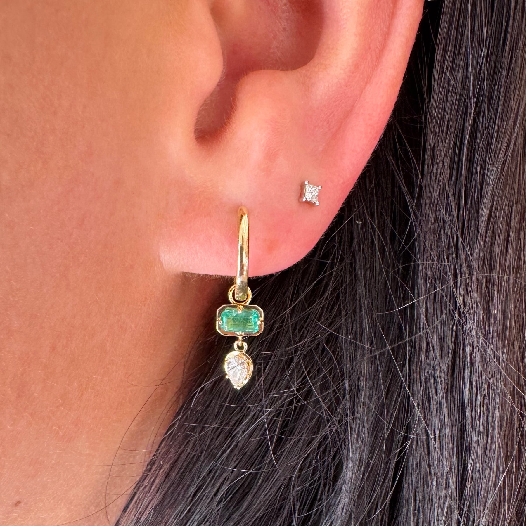 Emerald & diamond sparklers for your ears! These earring feature an emerald and diamond drop from a classic huggie.