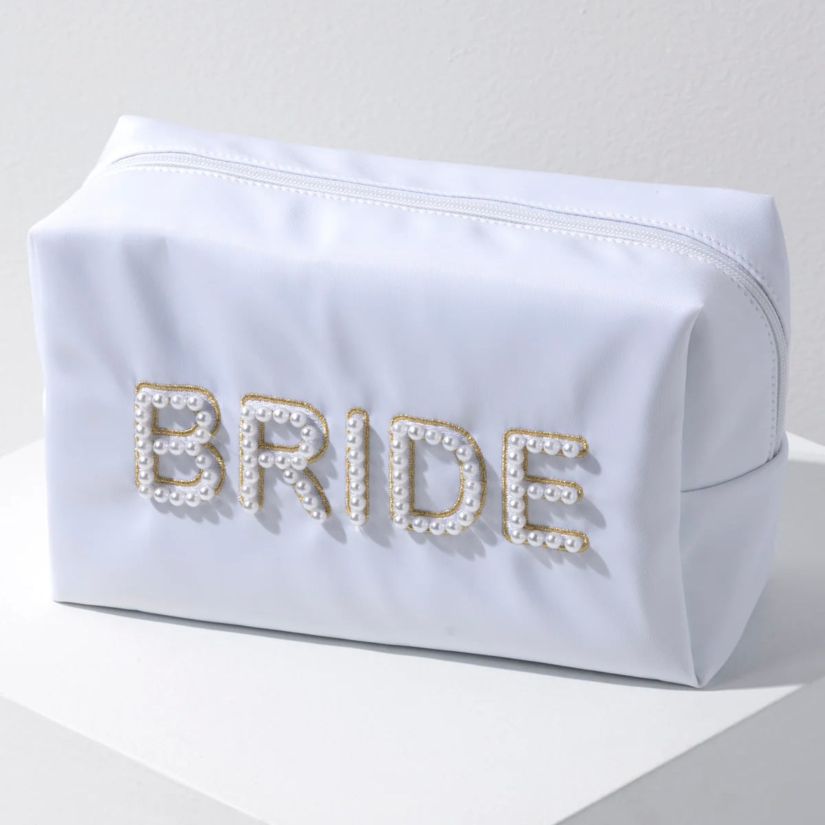 The Pearl "Bride" Large Zip Pouch is your ultimate bridal accessory! Crafted in pristine white with "BRIDE" elegantly spelled out in pearl embellishments, this pouch is the perfect mix of glamour and practicality.