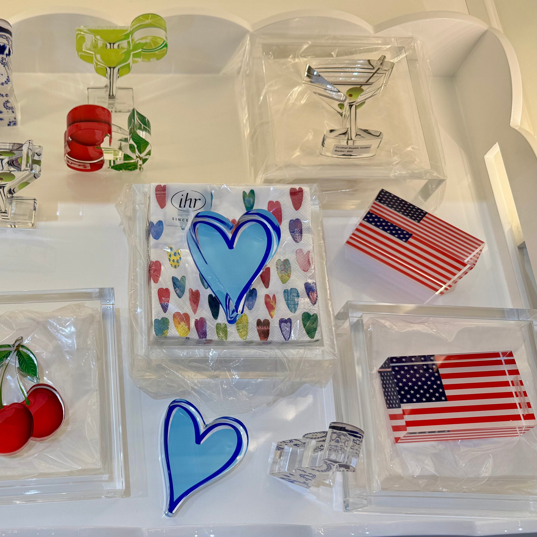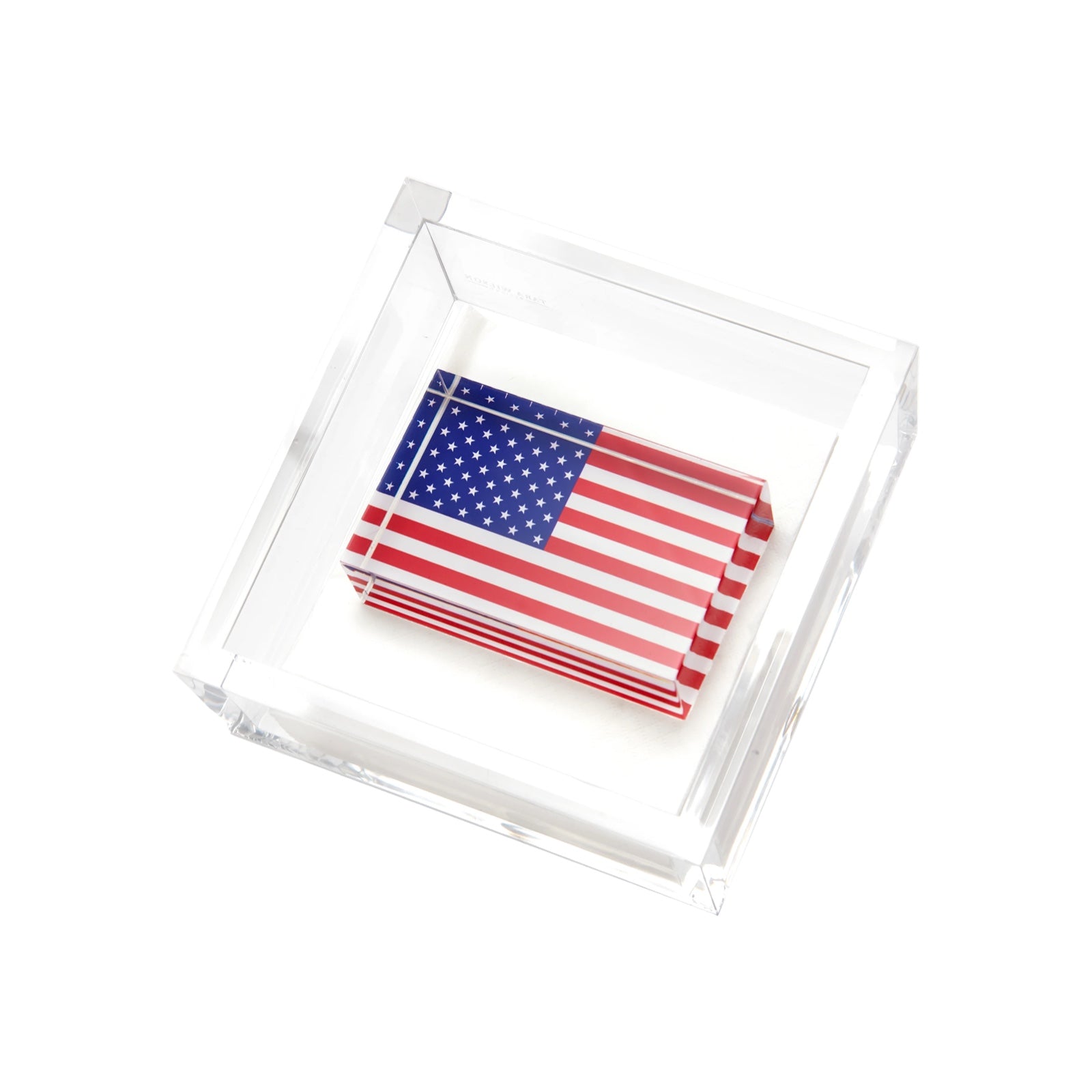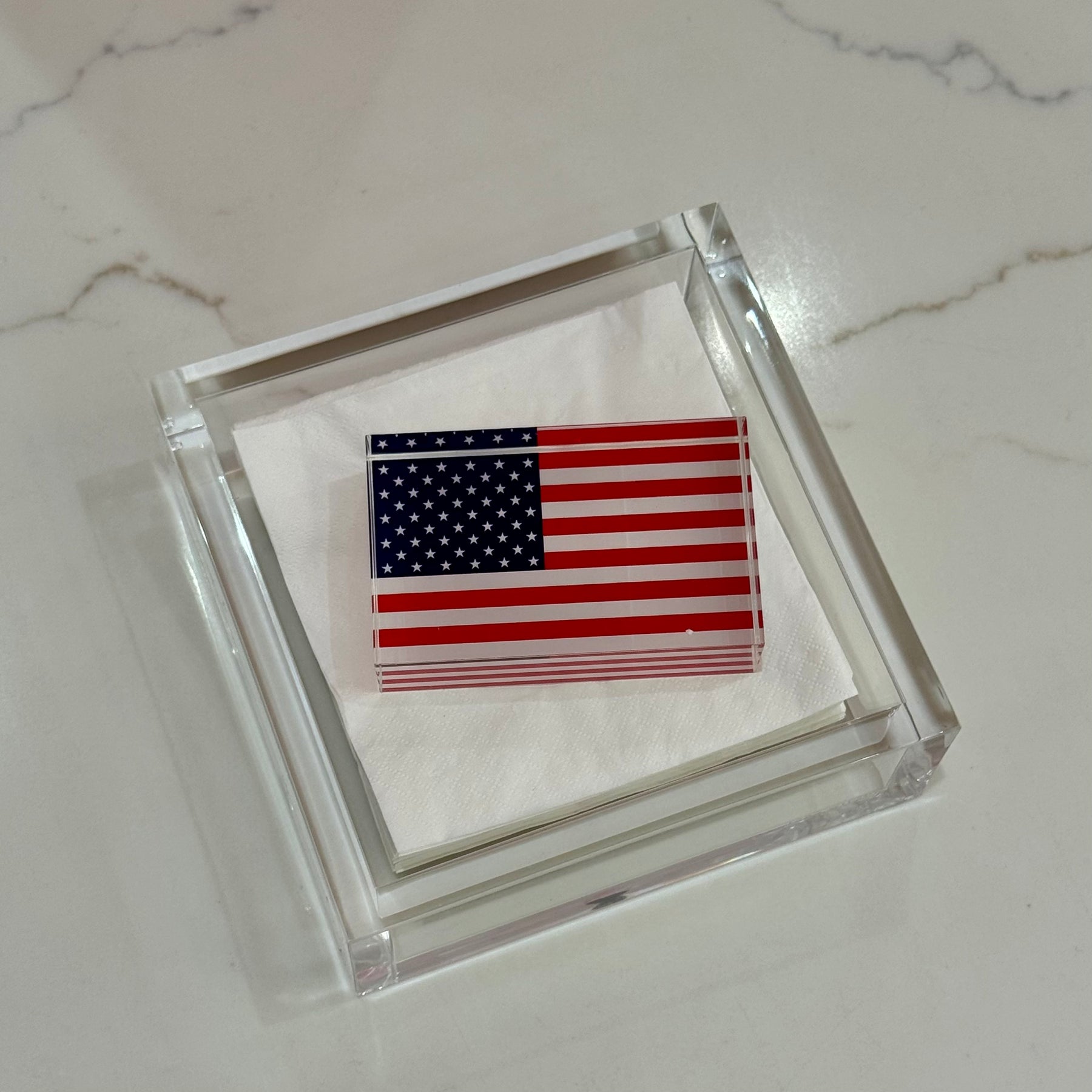 Celebrate in patriotic style with our American flag acrylic cocktail napkin holder. Featuring a bold flag-shaped weight, this festive piece keeps cocktail napkins neatly in place while adding a touch of red, white, and blue to your bar cart, dining table, or kitchen counter.