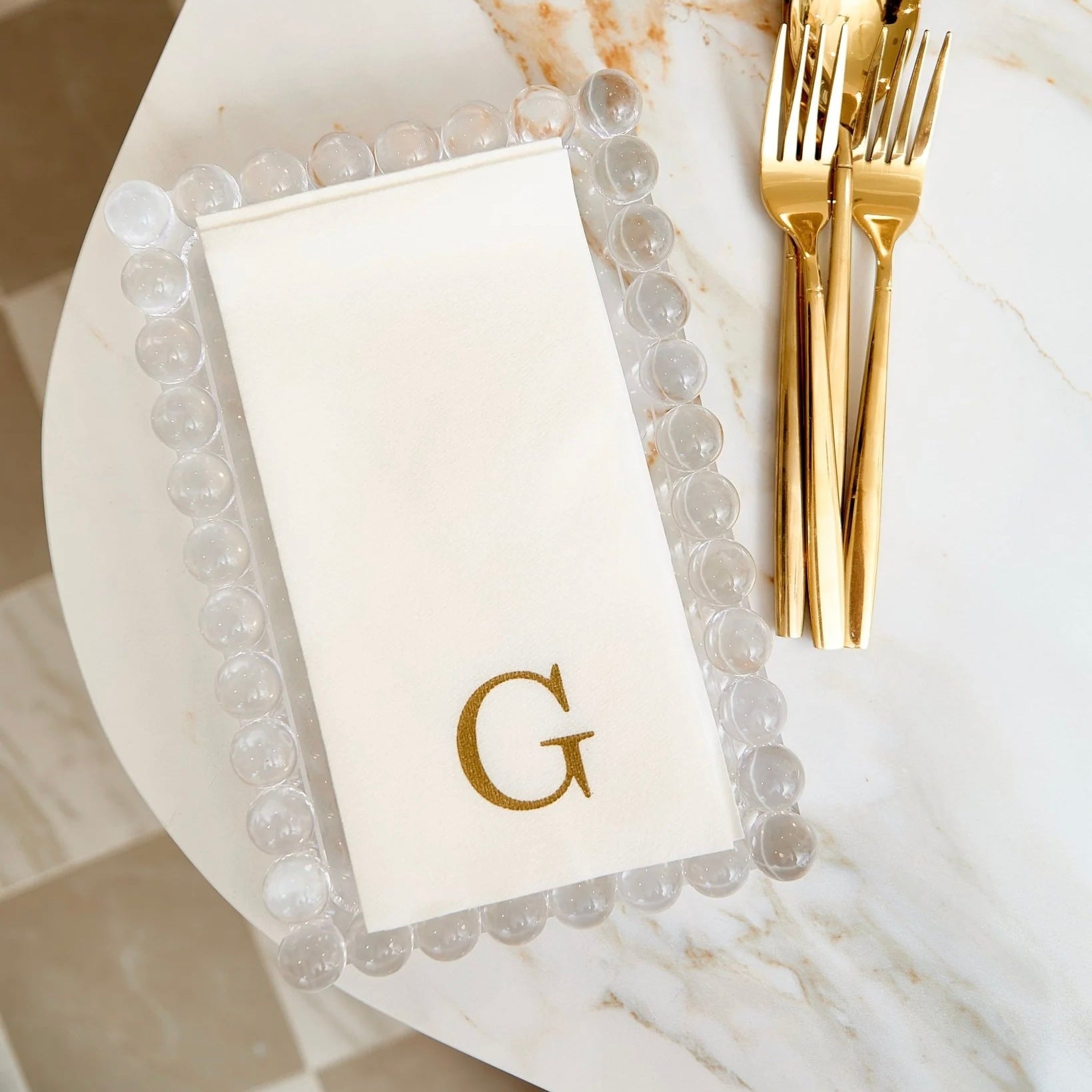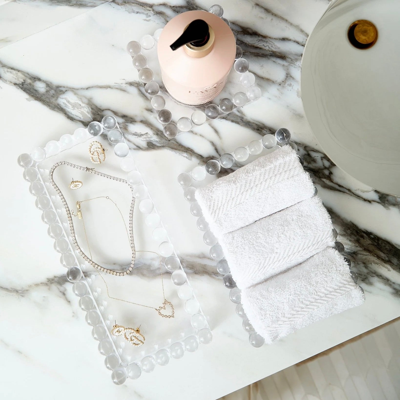 Add a touch of charm and function to your space with our Bubble Lucite Tray, designed to hold dinner napkins in style. The clear acrylic and playful bubble edging make it a perfect accent for bathrooms, powder rooms, or hosting setups. Beyond napkins, it’s just the right size to display a soap and lotion duo, your favorite perfumes, or other countertop essentials. Both practical and chic, this tray keeps everything organized while elevating any space.