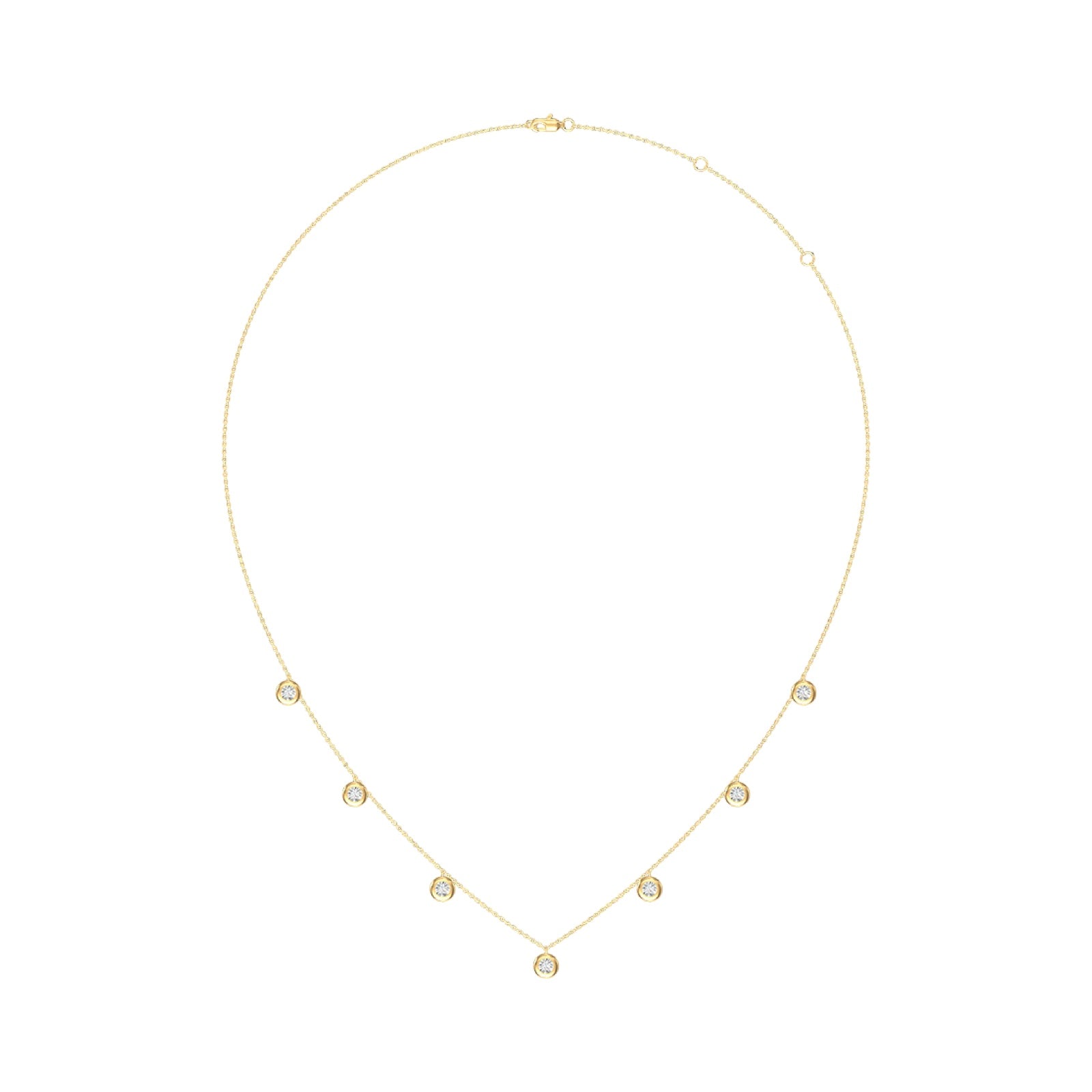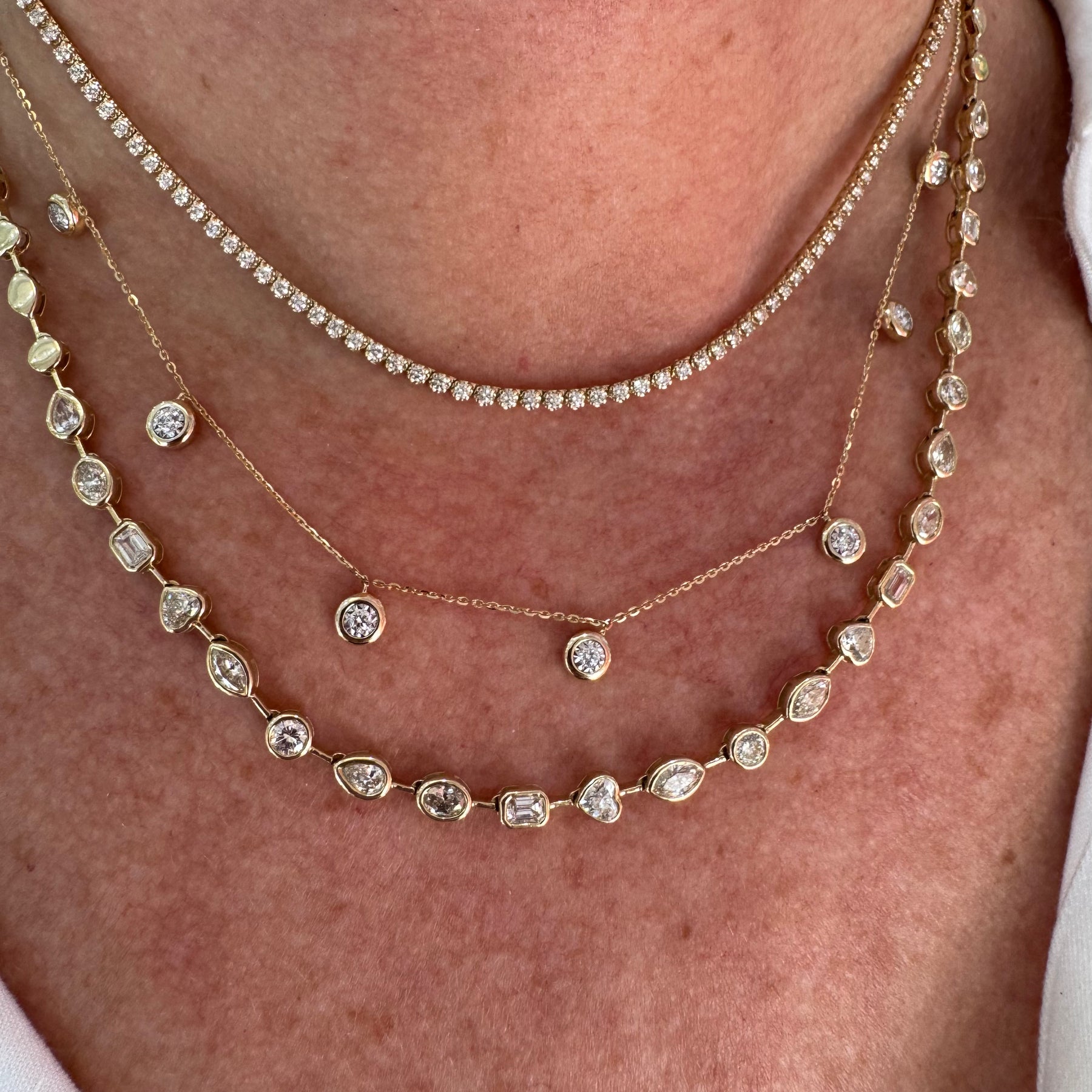 A fun take on a classic diamonds by the inch necklace! This necklace features .27 ctw of confetti diamond bezels along a beautiful diamond cut chain.