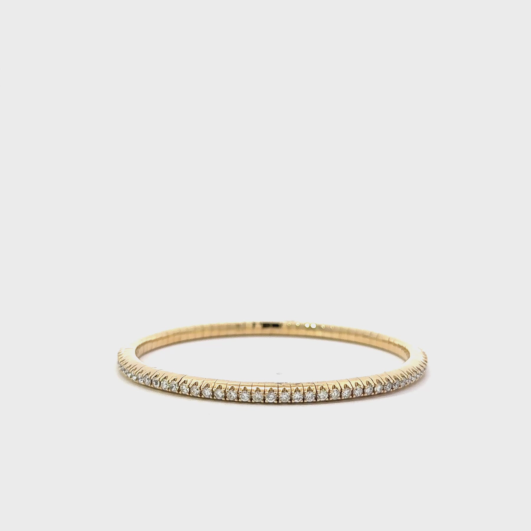 Our dream diamond bangle! This bracelet features 3.3 ctw of diamonds. This bracelet is a stretch bangle, which makes it an easy bracelet to take on and off. When the bracelet stretches, gold bars appear between each segment.